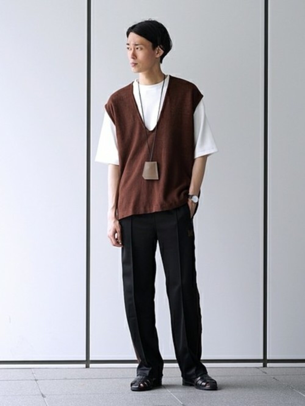 NUMAのベスト「WALENODE / ウェルノード別注 フレンチリネン Vネックベスト」を使ったコーディネート