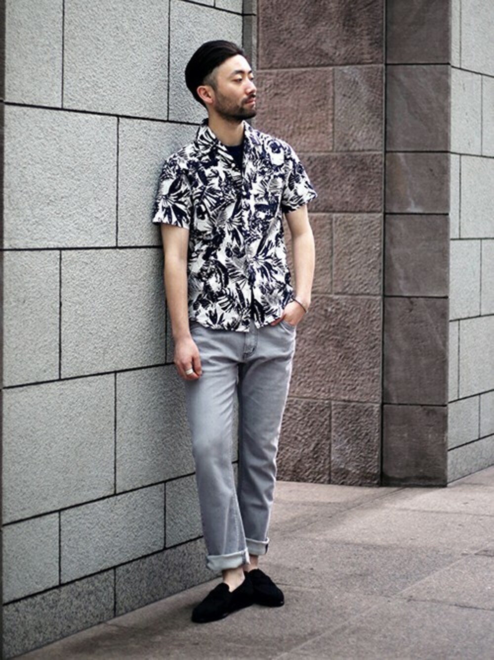 パンツをロールアップをして軽快な印象に。アロハ柄シャツはカジュアル感がでるので、足元はローファーで上品に。