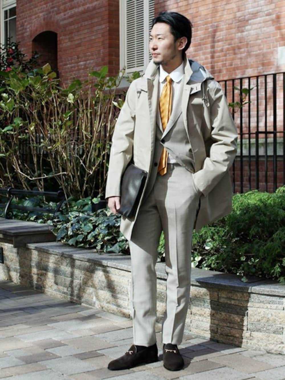 普段は、なかなか手に取らないオレンジ色のネクタイも、ベージュのスーツなら自然と馴染みます。明るい色使いなら、コートを羽織っていても、軽快な印象に!
