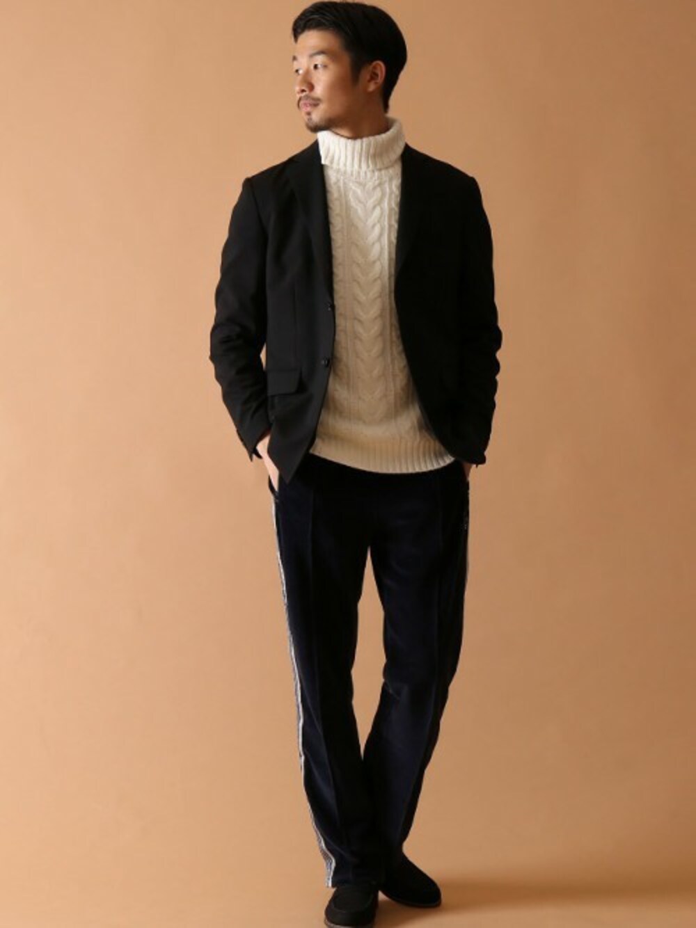 トレンドのトラックパンツもシャープなシルエットで構築することで上品な仕上がりに! 大きな編地が目を惹くニットは、417オリジナルのケーブル編みタートルネックニット。高級素材のカシミヤを織り交ぜる事でしなやかで柔らかい肌触りを実現。編み柄の組み合わせもオリジナルでデザインを行い、様々なアイテムとスタイリングを楽しんで頂けるよう絶妙なサイズバランスで編み立てました。