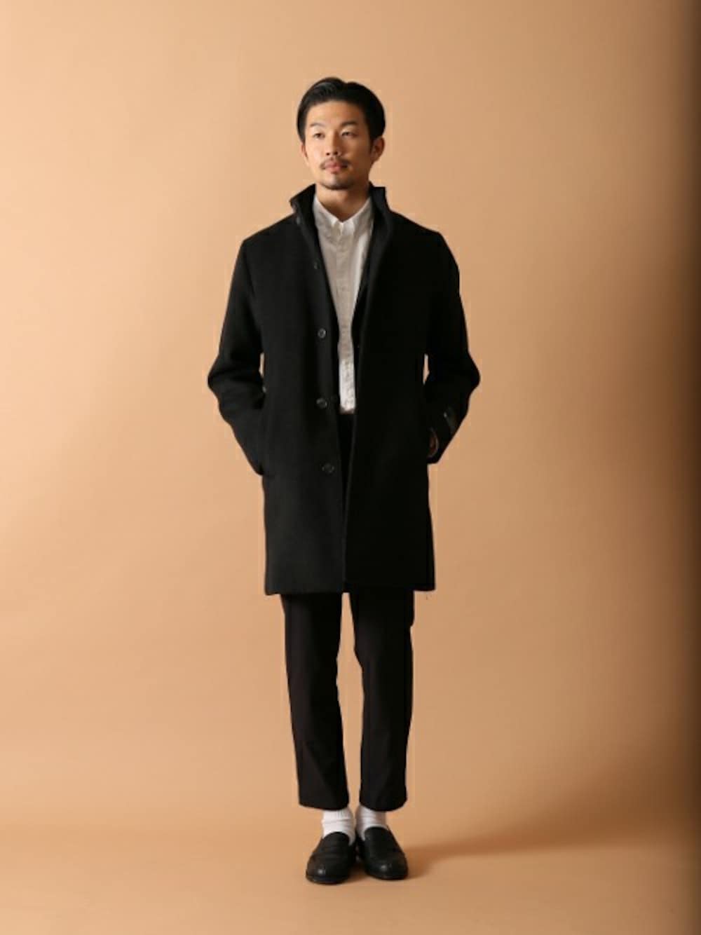 シンプルに着るコートスタイル。色味を抑えたシックな合わせでぐっと大人な雰囲気になります。 ◆カシミヤブレンドメルトンスタンドコート 冬の寒い気温から首周りを守ってくれるスタンドのデザインが特徴的なコート。カシミヤを混紡した417のオリジナル生地を採用し、高い保温性と柔らかな着心地を併せ持った一品に仕上がっています。