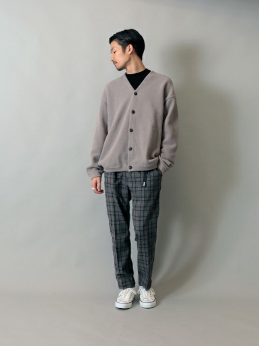 色味を抑えたモダンなスタイル。カーディガンとスラックスとの対比がバランス良いオススメスタイルです!
