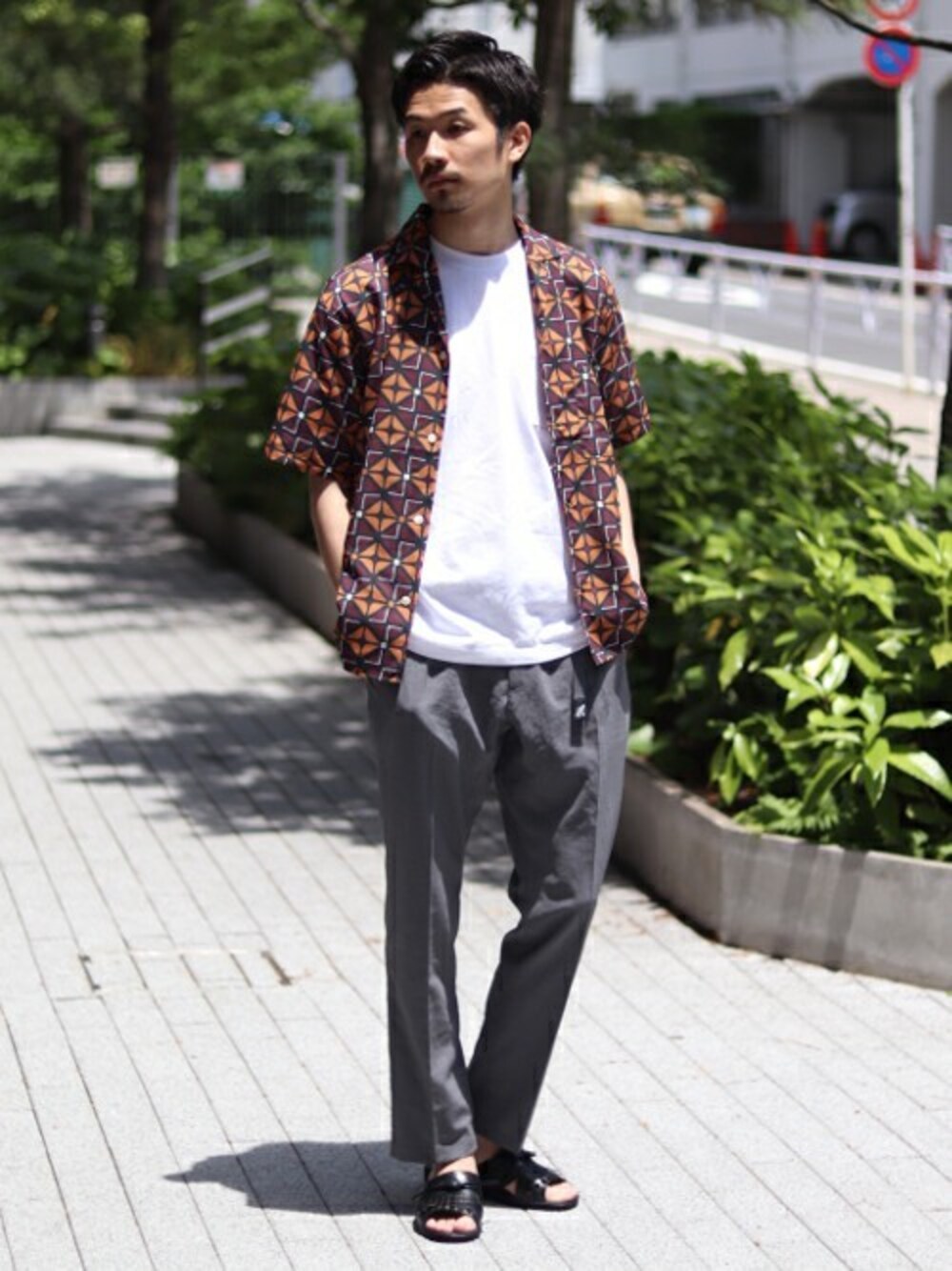 メゾンブランドにも作品を提供しているファクトリー「PARIS AUTHENTIQUE」のグラフィックを用いたスペシャルコレクションのオープンカラーシャツ。 目を惹くデザインのシャツに、ミニマルなアイテムで絶妙なバランス感に。足元にも遊び心のあるサンダルをチョイス。