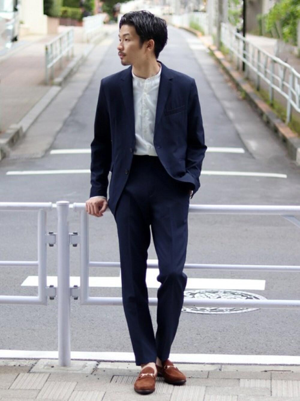 軽い肌触りとストレッチ性を備えた快適なネイビーセットアップスタイル。
