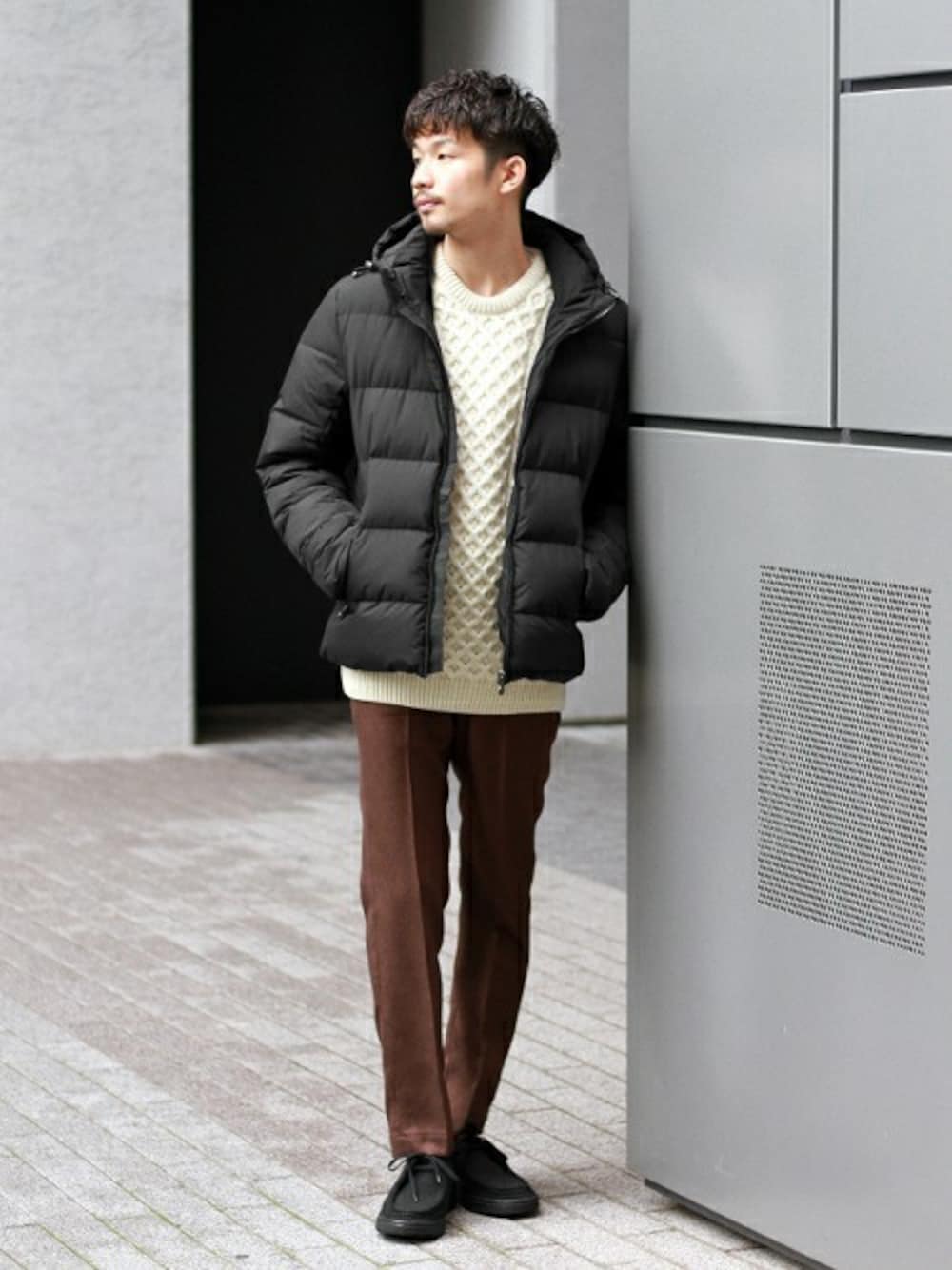 ブラック系のダウンジャケット/コートを着用したメンズの夏コーディネートの1枚目の写真