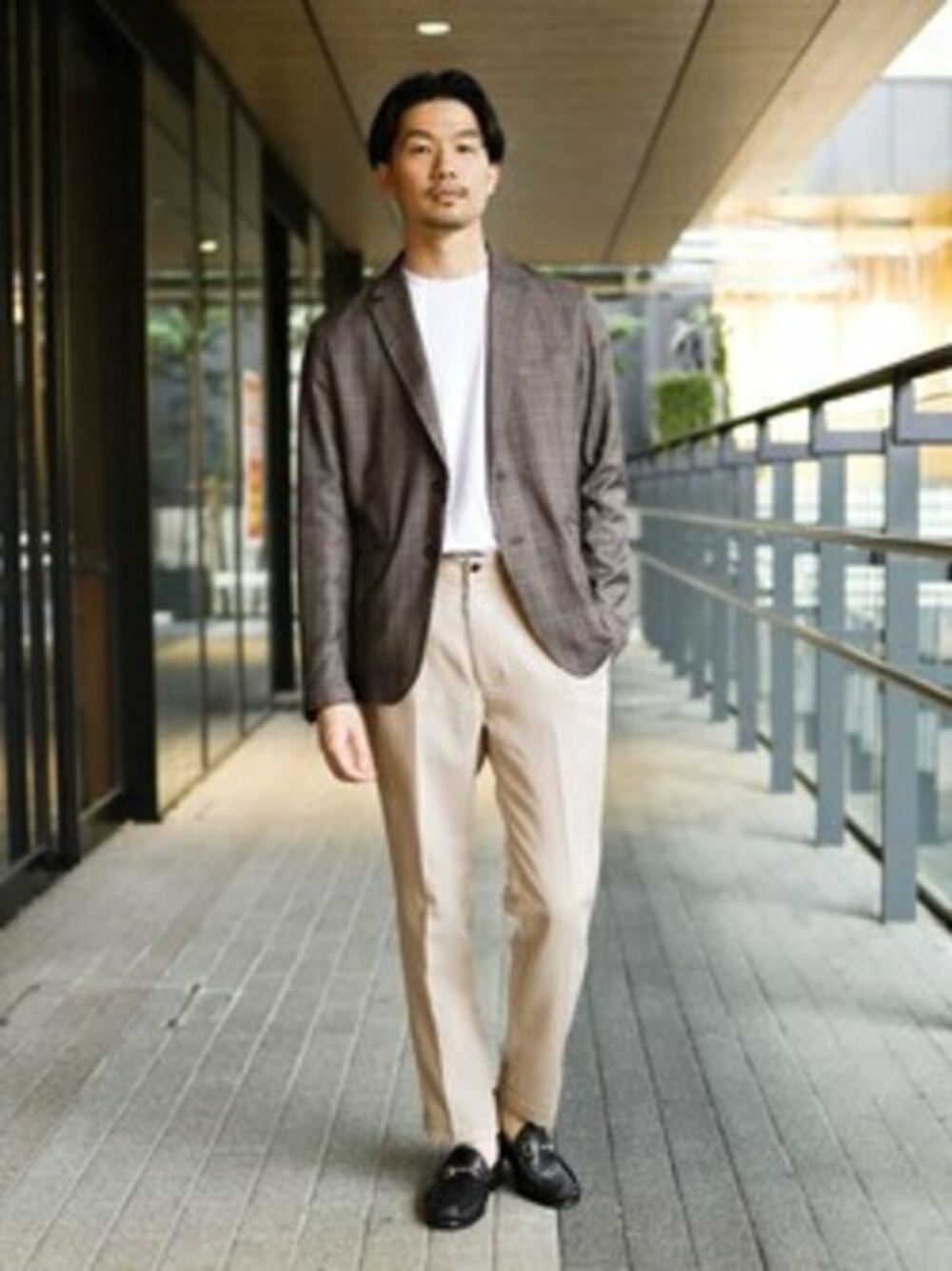 セットアップで販売しているものをセパレートでスタイリングを組みました。 パンツのトーンを合わせることで、チェックのジャケットも馴染んでくれるので 非常におススメの、コーディネートです。
