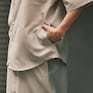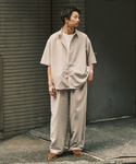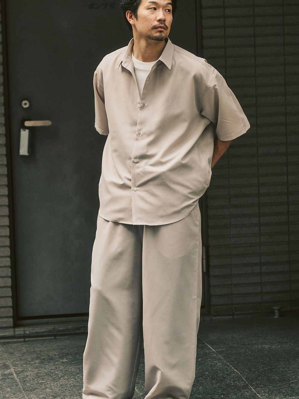 "WEB限定" 2点セット オーバーシャツサイクルセットアップ ------------------------------------- ドライタッチな素材を使用したオープンカラーシャツ+ワイドスラックス。スラックスはウエストゴム、イージーパンツ仕様で脱着も快適です。 モダンなディテールを継承しながらもボリュームのあるシルエットで設計した新型セットアップです。ゆったりとしたサイジングを強調するハリ感と、動きとともにしなやかに揺れるドレープ感がポイント。 シャツ:小ぶりなレギュラーカラー、大胆なシルエット。サイドにポケットを配しています。高い汎用性かつ目を惹く一着に仕上がっています。 スラックス:上品な雰囲気でありながらイージー仕様でリラックスした履き心地のワイドスラックス。裾にはスピンドルを採用し、スニーカーやレザーシューズ、サンダル様々なシューズと相性の良い仕上がりです。バックポケットはコンシールファスナー仕様に。サイドに三角カンを採用することで、デザイン性と実用性を備えています。 カラー:シックなブラック、ネイビーに都会的なチャコールグレー、アクセントになるベージュを採用。 単体でも使いやすく、レイヤードもしやすい仕上がり。リラックスした着心地、ミニマルな機能性、モダンなカラーリングで長いシーズン活躍する珠玉のセットアップです。 合わせるインナーは下記がおすすめです。 26071312100010 utility everyday Tシャツ *接触冷感 *速乾 *UVカット *マシンウォッシャブル