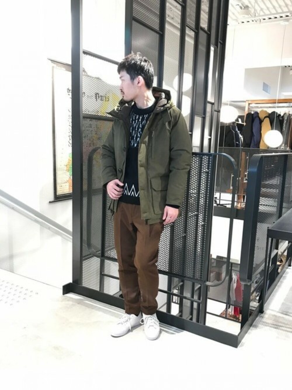 アースカラーダウンスタイル EDIFICEオリジナルダウンコートを使用したカジュアルスタイル。ハリのある生地を使用しており、無骨な印象のあるアイテムは、インナーに映えるフェアアイル柄のニットでアクセントを加える事で洒落感のある印象に。