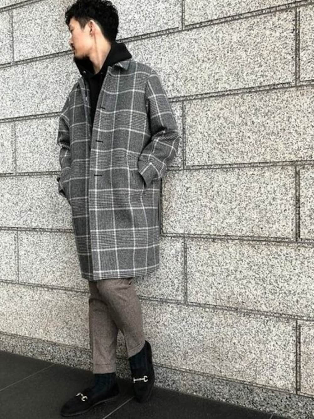 チェックコートスタイル 今季人気の高いグレンチェックコート。存在感のあるデザインは、シックな色合わせでその他アイテムを組み合わせると上品な印象に仕上がります。インナーにはパーカーアイテムを取り入れることで、コートの緩めサイジングと程よいリラックス感があるのもポイントです。