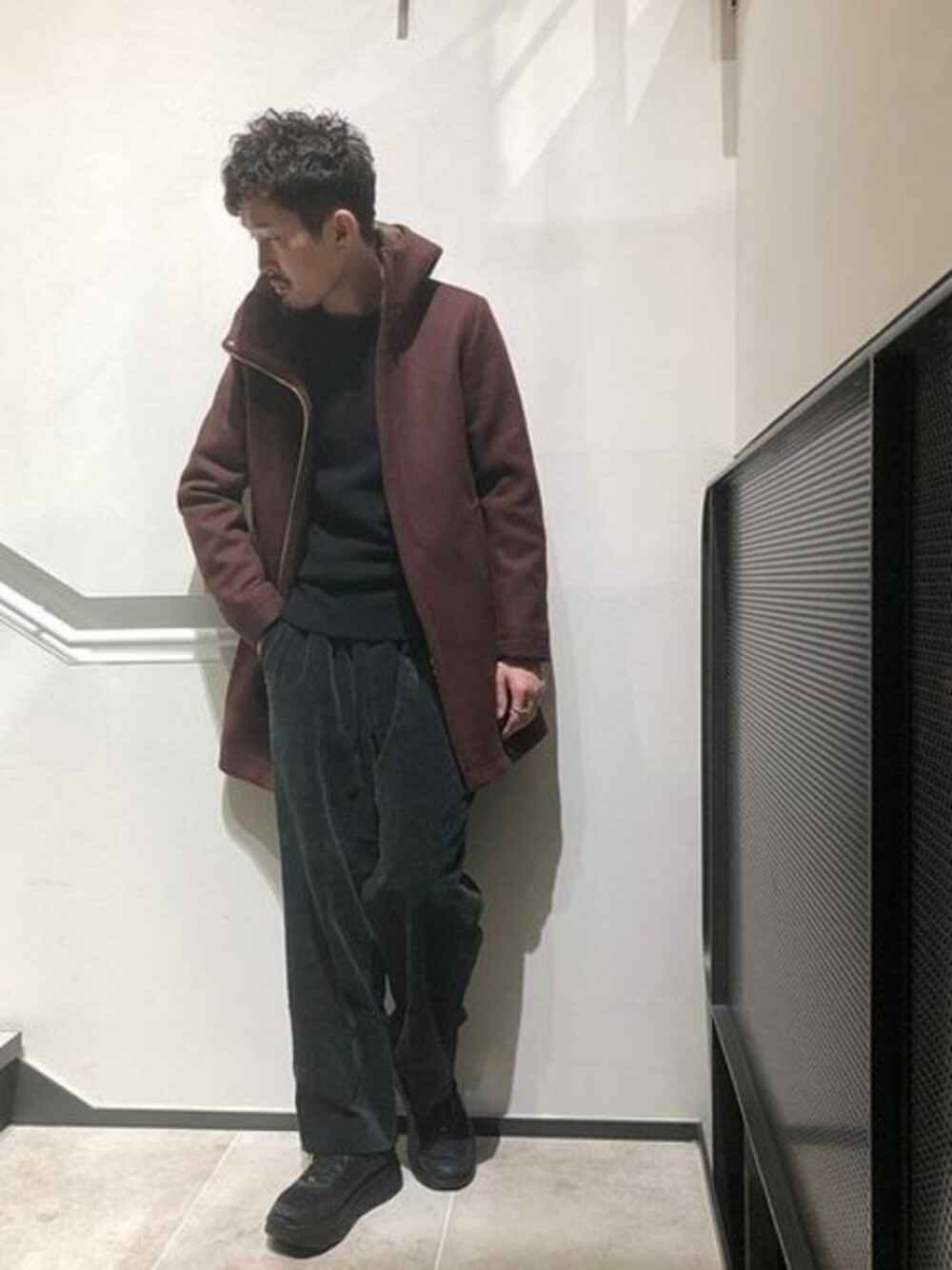 メルトンフードコートスタイル 厚手のメルトンウール生地を使用したEDIFICEでは定番のフードコートモデル。発色の良いワインレッドカラーは、ブラックカラーでまとめたスタイリングに合わせると上品な大人のスタイリングに。足元に合わせた【HOKA ONE ONE/ホカオネオネ】がスポーティーなアクセントに仕上がっています。