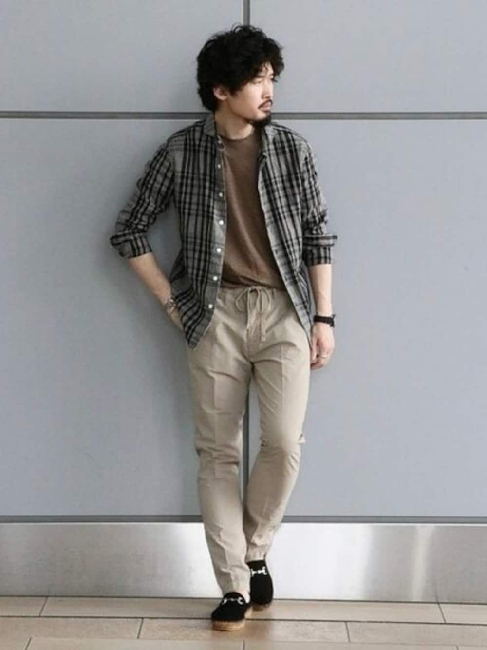 BRIGLIA シアサッカーイージーテーパー ベージュ×ブラックでリラックスモダン。 ■身長:177cm ■普段サイズ:M ■着用サイズ:048 ■サイズ感:タイト ■生地感:シアサッカー ■着心地:サラッとしていて涼しい