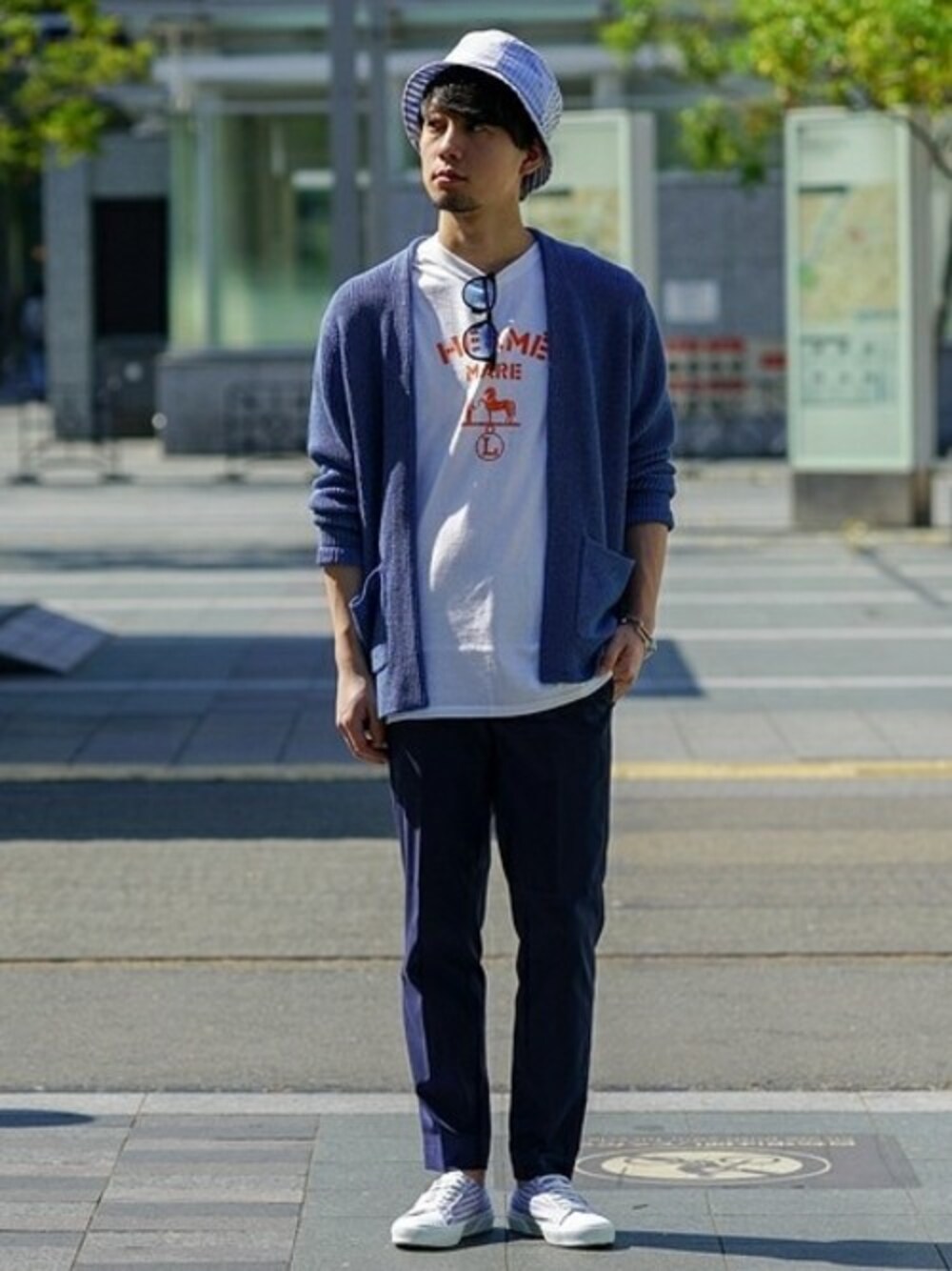 LES CINQ LETTRES. / レ サンク レトル HEME Tee 【LES CINQ LETTRES. / レ サンク レトル】 大阪を拠点に活動するアートディレクターryo kaneyasu氏が手がけるブランド。 Tシャツのプリントを目立たせたかったので、反対色のブルー系でまとめてプリントが目立つようにスタイリングしました。 身長:168センチ / 普段サイズ:S / 着用サイズ:S サイズ感:Sサイズでやや丈が余る 素材感:ハリのある生地 着心地:適度なゆるさで夏に着やすそう