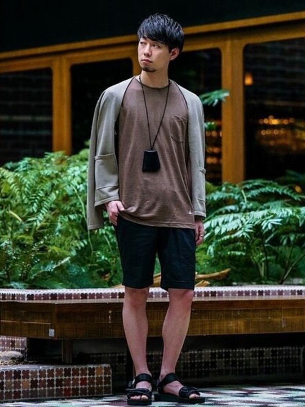 GUYROVERリネンジャージーポケットT ブラウン×ブラックで大人のリゾートスタイルに。 リネン素材を使ったアイテムを落ち着きある色味で組み合わせました。 身長:168センチ / 普段サイズ:S / 着用サイズ:S サイズ感:Sサイズで身巾・肩周りはジャスト。 素材感:やや光沢がありしなやかな生地 着心地:フィット感が高く、さらっとした涼しげな着心地