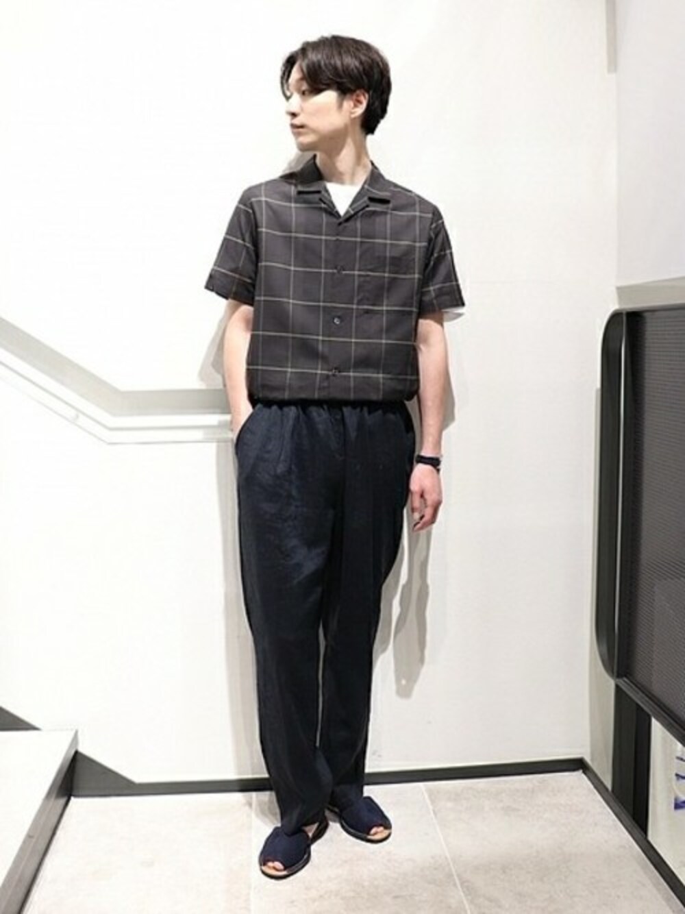 コットンシルクチェックオープンカラー シルク紺の上品なチェックシャツ。生地も柔らかくさらりと着て頂けます。 身長:176cm/普段サイズ:M/着用サイズ:M サイズ感:細身でスッキリ 素材感:柔らかくて程よい光沢 着心地:軽くて涼しい