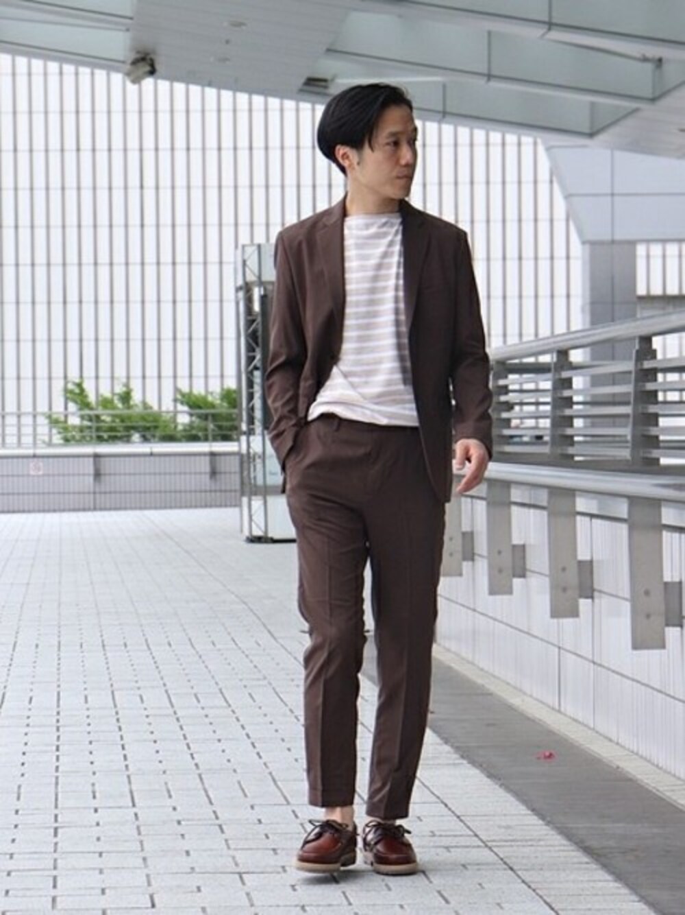 CLICK ライトメランジトロ 2BJK トレンドのブラウンカラーのセットアップを同系色のボーダーカットソーとデッキシューズで統一感のあるマリンスタイルに。 身長:170センチ / 普段サイズ : S / 着用サイズ:S サイズ感 : ジャストなサイズ感。 素材感:メランジ調の表情のある素材感。 着心地:軽やかで非常に薄い生地なので、夏でも快適に着られる。