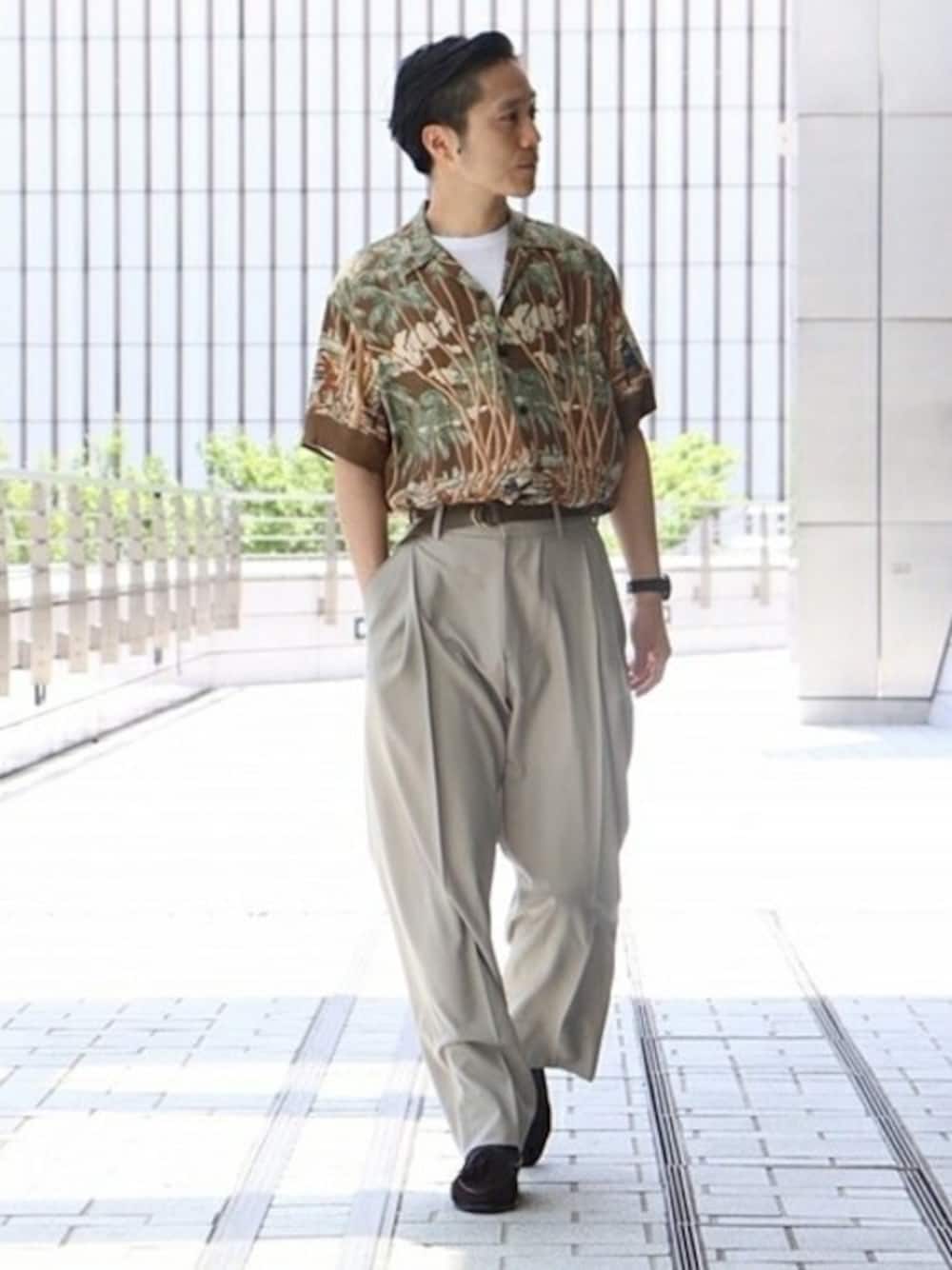 PSG PALM TREE SHIRTS トロピカルウールのスラックスを合わせた上品なアロハシャツスタイル。 身長:170センチ / 普段サイズ : S / 着用サイズ:S サイズ感:ゆとりのあるシルエット 素材感:レーヨン特有のドレープ感が綺麗な素材感。 着心地:滑りがよく、快適な着心地。