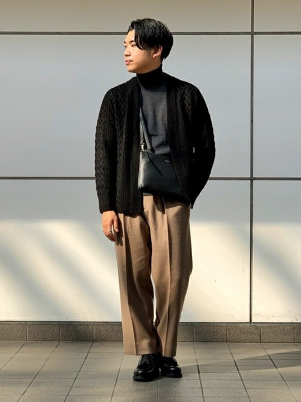 ALAN CABLE BL c/d ニットオンニットの着こなしはこなれ感をぐっと出すにはうってつけの着こなし。 グレーやキャメルの暖かい色味のアイテムを合わせて優しい印象に。 身長:173cm/普段サイズ:L/着用サイズ:L サイズ感:ジャストサイズなので少しゆったりめのサイズ選びをするのがオススメ 素材感:ケーブル編みがわかりやすい生地を使用。肉厚のアイテム 着心地:秋はメインアウターとして使えるほどの肉感がありアウター感覚で使える。
