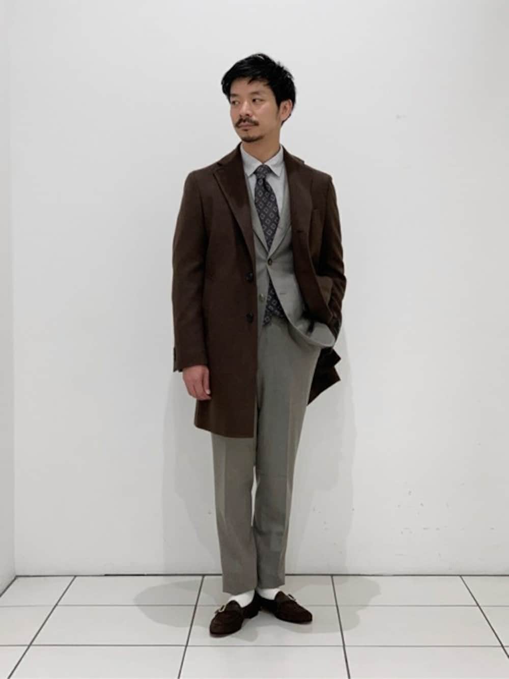 ブラウンで統一したビジネスコートスタイル。 サキソニーのスーツにカシミアをブレンドしたチェスターコートでワンランク上の着こなしを。 身長:170cm/普段のサイズ:M/着用サイズ:44 サイズ感:細身 素材感:上品で温かみのある 着心地:柔らかく軽い