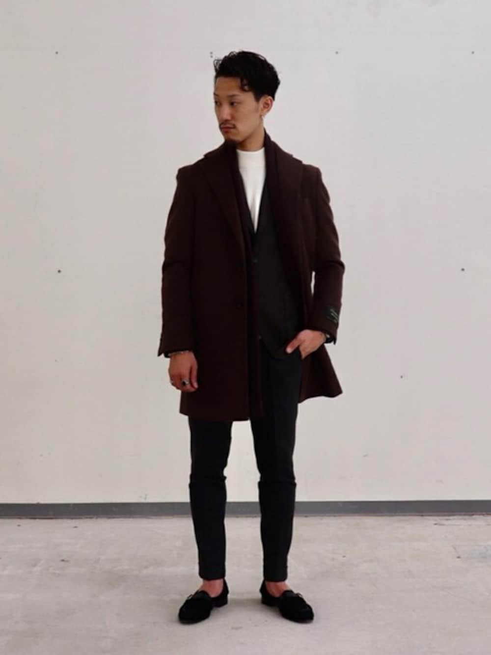 にしやんのチェスターコート「ウールカシミヤ チェスターコート」を使ったコーディネート