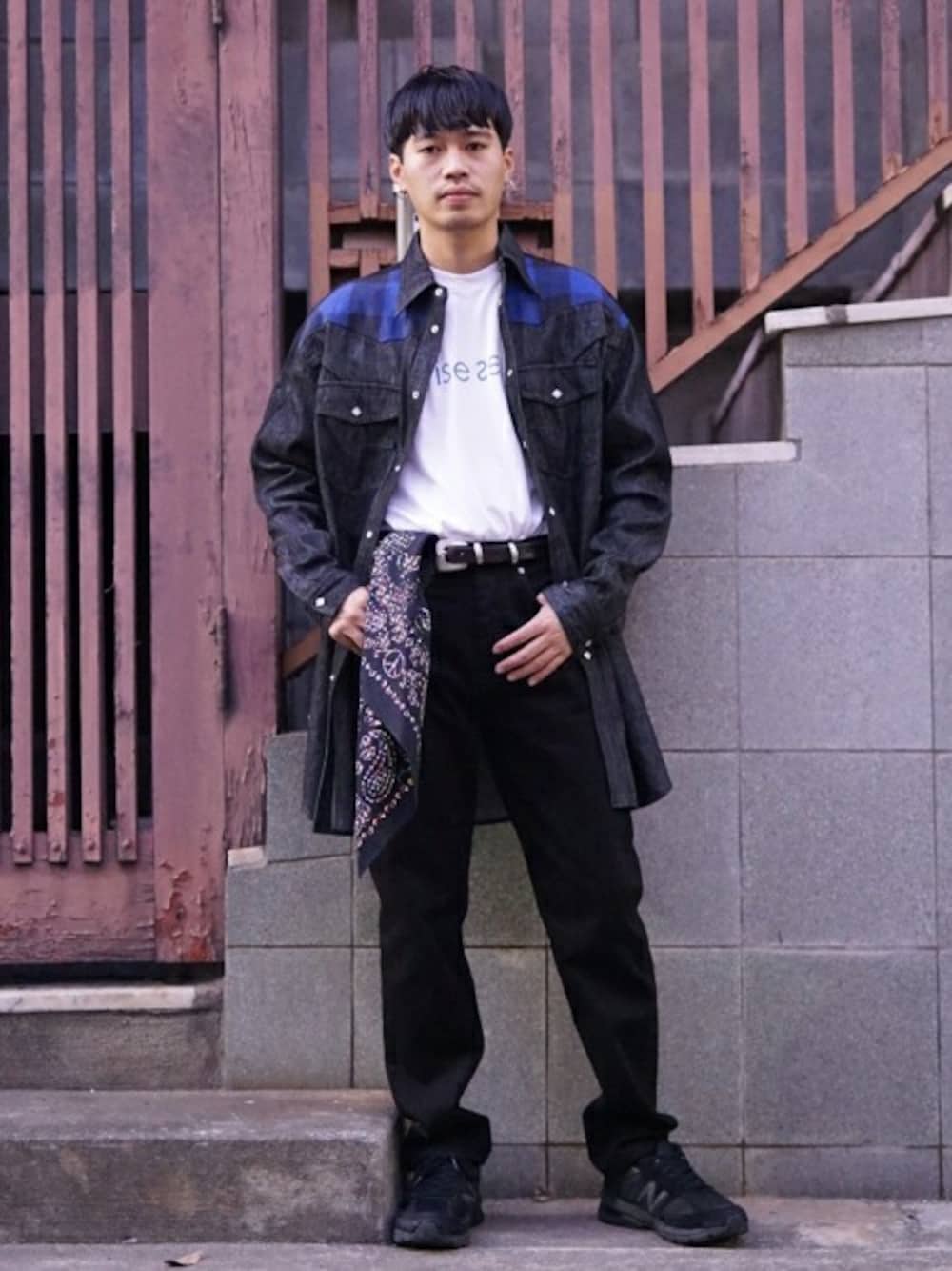 黒を基調にデザインされたウェスタンシャツをシンプルに。 バンダナがアクセントです。 インナーに真っ白でなくプリントものを持ってきたのも作戦です。