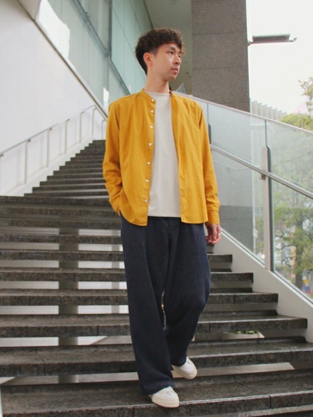 【soleil turpan コットンリネン ノーカラーSH】 発色のキレイなノーカラーシャツをシャツではなくあえて少し大きめにアウター感覚で着た春コーデ 中のカットを白でなく生成にし色の段階をつけ大人っぽくしました。 身長 : 178 / 普段サイズ : M、L / 着用サイズ : XL サイズ感 : スッキリ 素材感 : サラサラ 着心地 : 柔らかく軽い