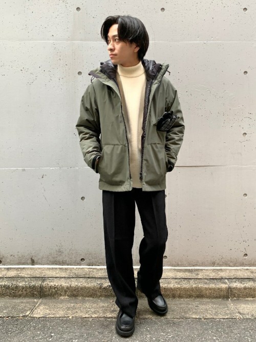 アウトドアっぽいアウターをきれいに着こなす、がテーマです。 カジュアルなアウターにきれい目ニットとスラックスのようなクリースの入ったパンツでカジュアルアップスタイルを。 ボトムスから足元まで、色をまとめ統一感を出しました。