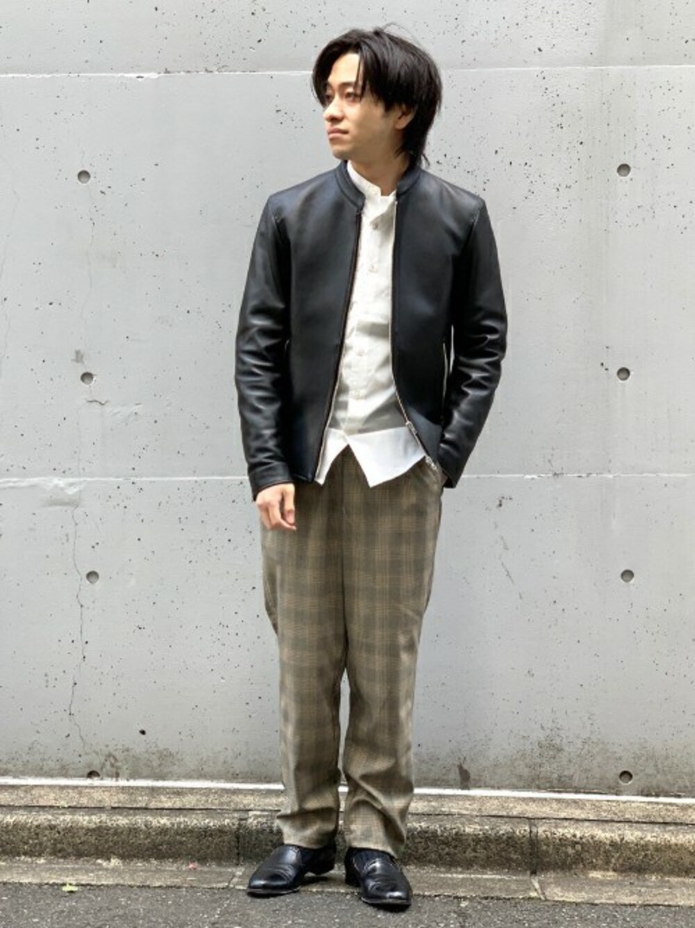レザーアイテムとシャツでキレイめにコーディネート。 かっちりしすぎないようにチェックパンツを合わせました。 上質なレザーを用いることで末長く着用いただけるおすすめアウターです!