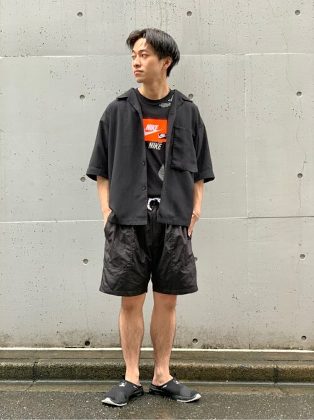 オレンジロゴを目立たせるようオールブラックでスタイリング。 シャツを羽織ってキレイめ要素をプラスさせました。 【NIKE DIY AOP SS TEE】 身長:165㎝ / 普段サイズ:S / 着用サイズ:M サイズ感: ゆったりめのシルエットで着丈長め 素材感:薄手の素材 着心地:伸縮性もあり快適な着心地