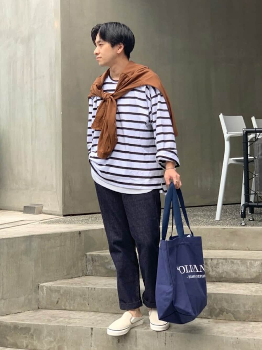 新作ブッチャーパンツにボーダーカットソーを合わせてリラックス感のあるフレンチスタイルに。