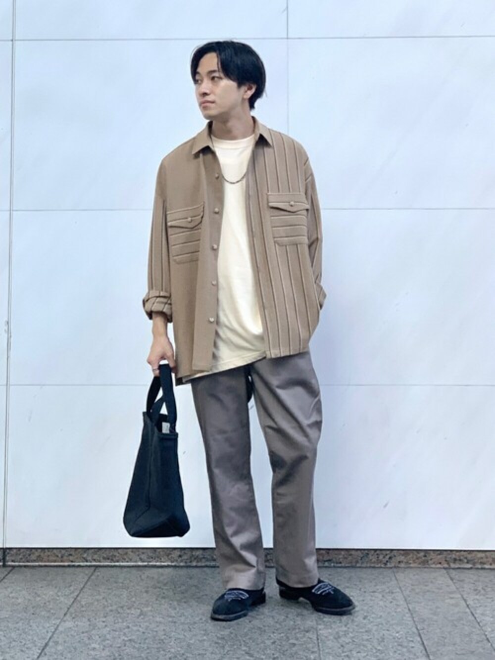KIKAWAのシャツ/ブラウス「【TAUPE/トープ】 スウィッチングストライプCPOシャツ」を使ったコーディネート
