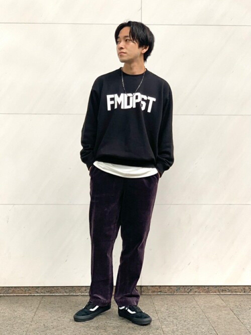ストリートなスタイルを暗めの色使いで大人っぽく仕上げました。 【 FAMOUS DEPARTMENT STORE】 FMDPST スウェット 身長:165㎝ / 普段サイズ:S / 着用サイズ:L サイズ感:ジャストサイズ 素材感:柔らかいコットンネル素材 着心地:肌あたりもよく着やすい
