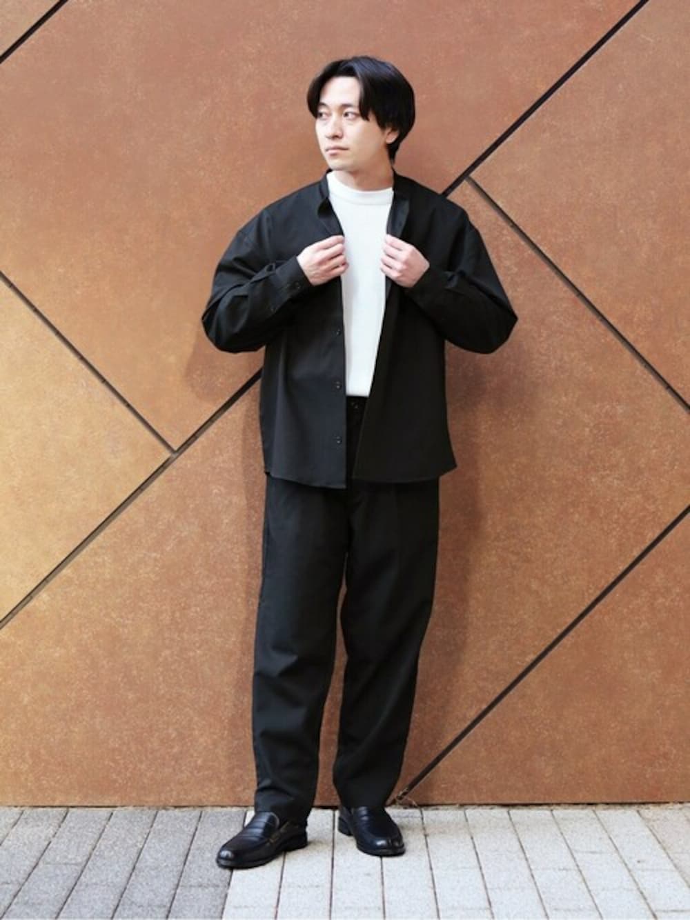 シャツセットアップを使ったモノトーンスタイルは インナーを潔く白で合わせて上品なカジュアルスタイルに。
