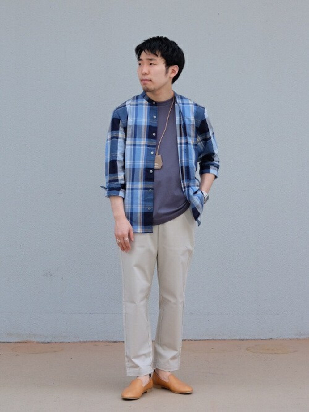 インディゴで染めたシャツは、リネン素材で夏場まで活躍する逸品です。 ブルー×オフホワイトの組み合わせには小物とシューズを差し色のベージュに。メリハリあるコーディネートに。 トップス:【INDIGO リネン ノーカラーシャツ】 普段サイズ:M / 着用サイズ:M サイズ感:全体的に細身 素材感:薄手の生地 着心地:シャリ感がありサラッと着れる インナー:【soleil turpan オーガニック TEE】 普段サイズ:M / 着用サイズ:M サイズ感:身幅はややゆったり 素材感:薄手の生地 着心地:サラッとしている為着やすい