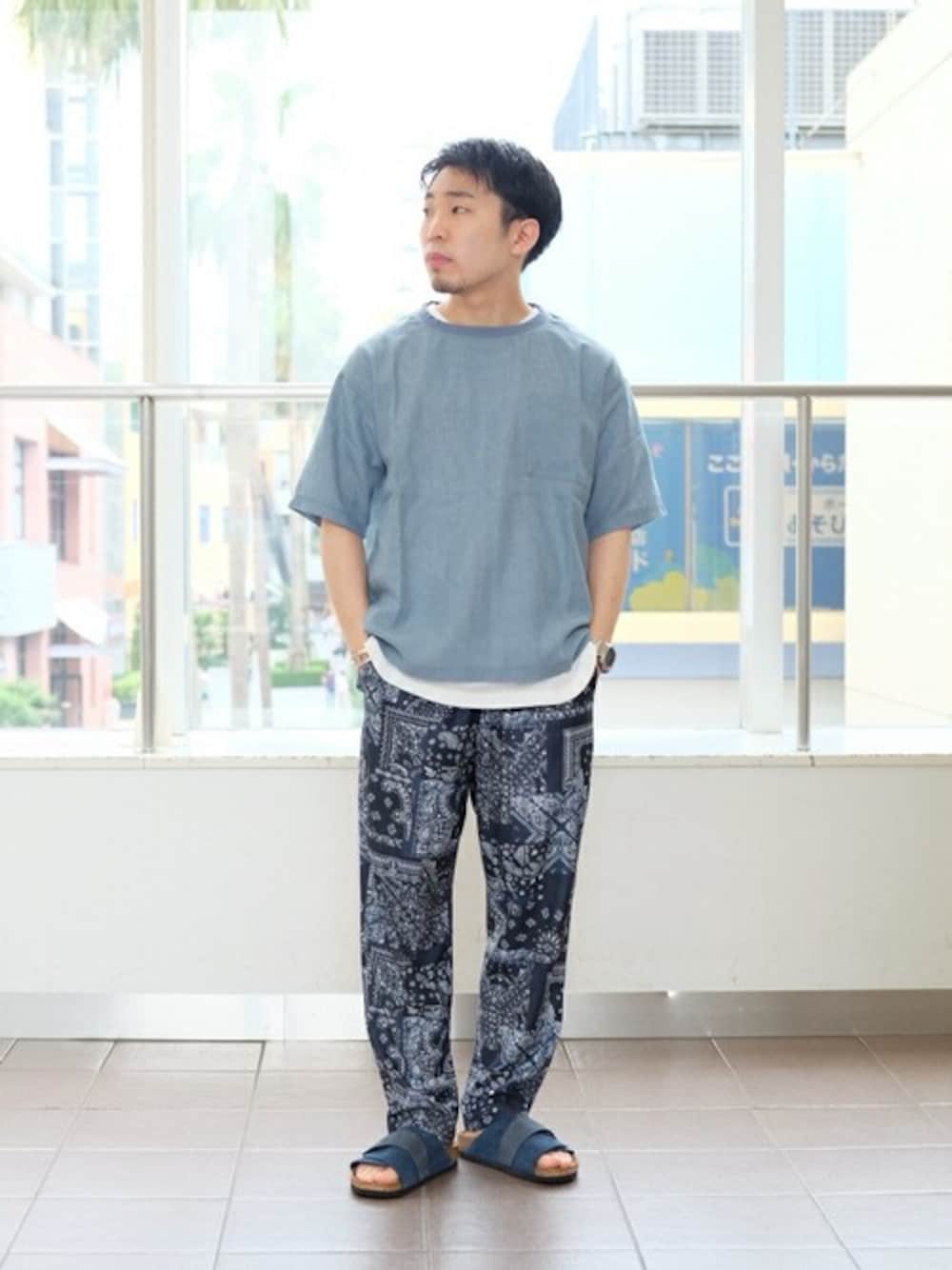 プルオーバーシャツはシャツの生地の為Tシャツよりきちっとした印象。 柄パンツもブルートーンでまとまりあるコーディネートに。 ************************ トップス:【COOLMAX BELGIAN リネンプルオーバー】 普段サイズ:M / 着用サイズ:L サイズ感:やや細身 素材感:リネン素材でシャリ感のある素材 着心地:身幅は広い為着やすい ボトムス:【クレイジー バティックパンツ】 普段サイズ:M / 着用サイズ:S サイズ感:ややゆったり 素材感:薄手でさらっとした素材 着心地:ウエストはゴムでゆったりしていて履きやすい ************************