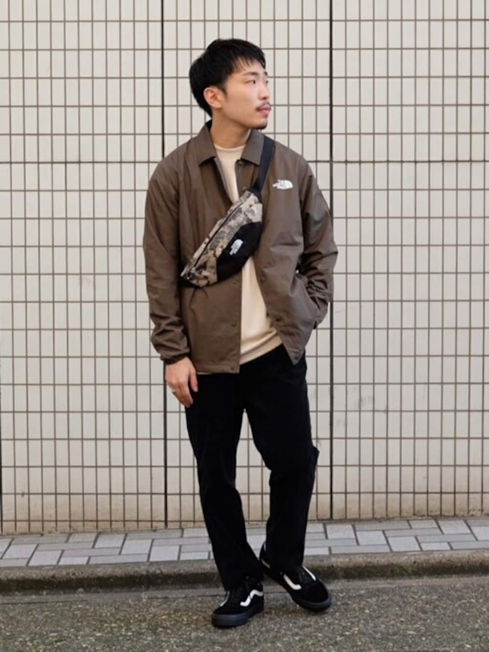 カーキのコーチジャケットはインナーにベージュを使用しアースカラーのコーディネートにより、スポーティーすぎずカジュアルに着用できます。 【THE NORTH FACE コーチジャケット】 身長:165㎝ / 普段サイズ:M / 着用サイズ:M サイズ感:やや細身 素材感:ハリのある素材 着心地:ナイロンで軽さがあり着用しやすい 【コーデュロイブッチャーWORKパンツ】 身長:165㎝ / 普段サイズ:M / 着用サイズ:S サイズ感:もも周りにゆとりあり 素材感:伸縮性のある素材 着心地:ウエストもイージー仕様で快適な履き心地