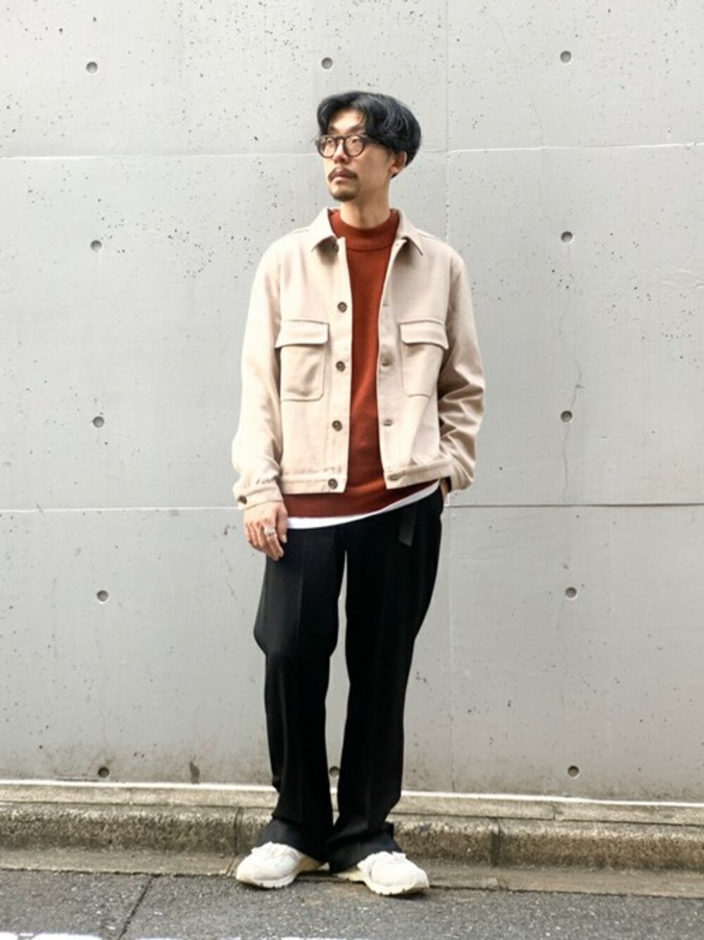 トレンドベージュと、暖色系オレンジで季節感と色あわせを意識しました。 明るめなあわせのトップスコーディネートなので、パンツは黒で引き締めて、足元はクリーンな感じを出すため、白のスニーカーで抜け感を。