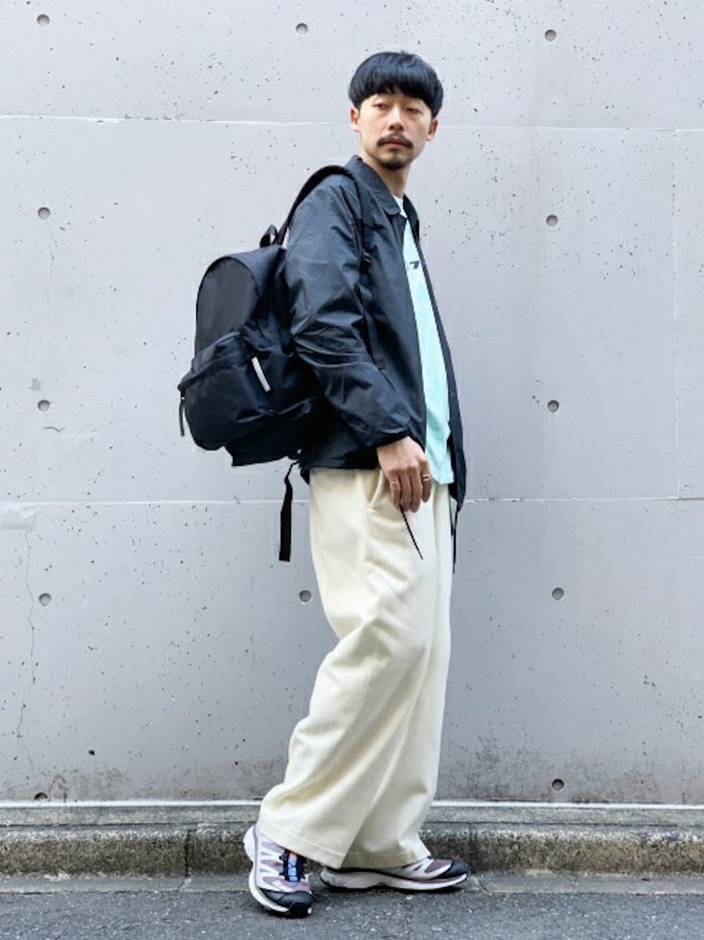 主張が控えめなタイダイを春らしいボトムで季節感を演出しつつ、クールなスポーティテイストもプラスし、アクティブなスタイリングに。 センターロゴがアクセントですが、上から重ねるブルゾンやジャケット系のボタンを上半分くらいまで閉じて、中心から裾あたりにかけてチラッとタイダイを覗かせるのもアリかと思います。
