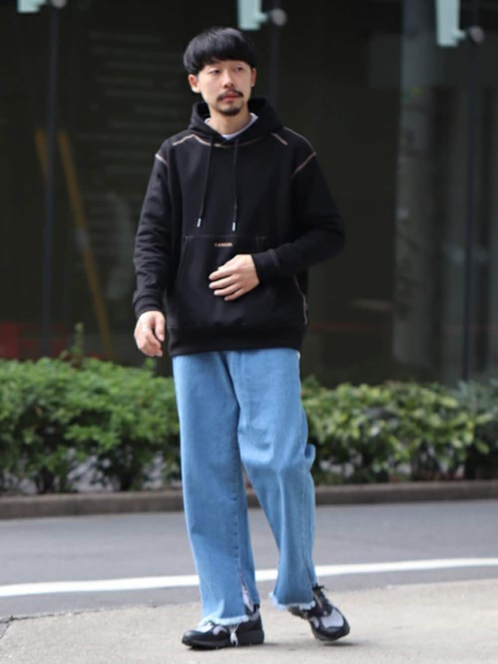 ブラック系のパーカーを着用したメンズの冬コーディネートの1枚目の写真