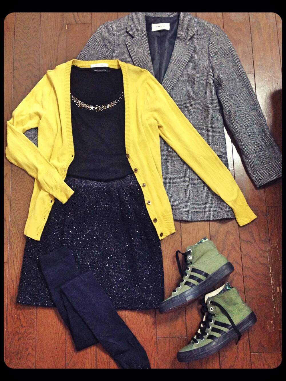 オールブラックコーデに黄色のカーディガンを合わせて。大人っぽくより細身に見えるブラックはやはり最強! ジャケットを羽織ると袖だけ黄色がチラ見せになって映えます。 メンズライクのジャケットはアウトレットで。この時期ぴったり。 パンプスだと決め過ぎなので、スニーカーを合わせて。