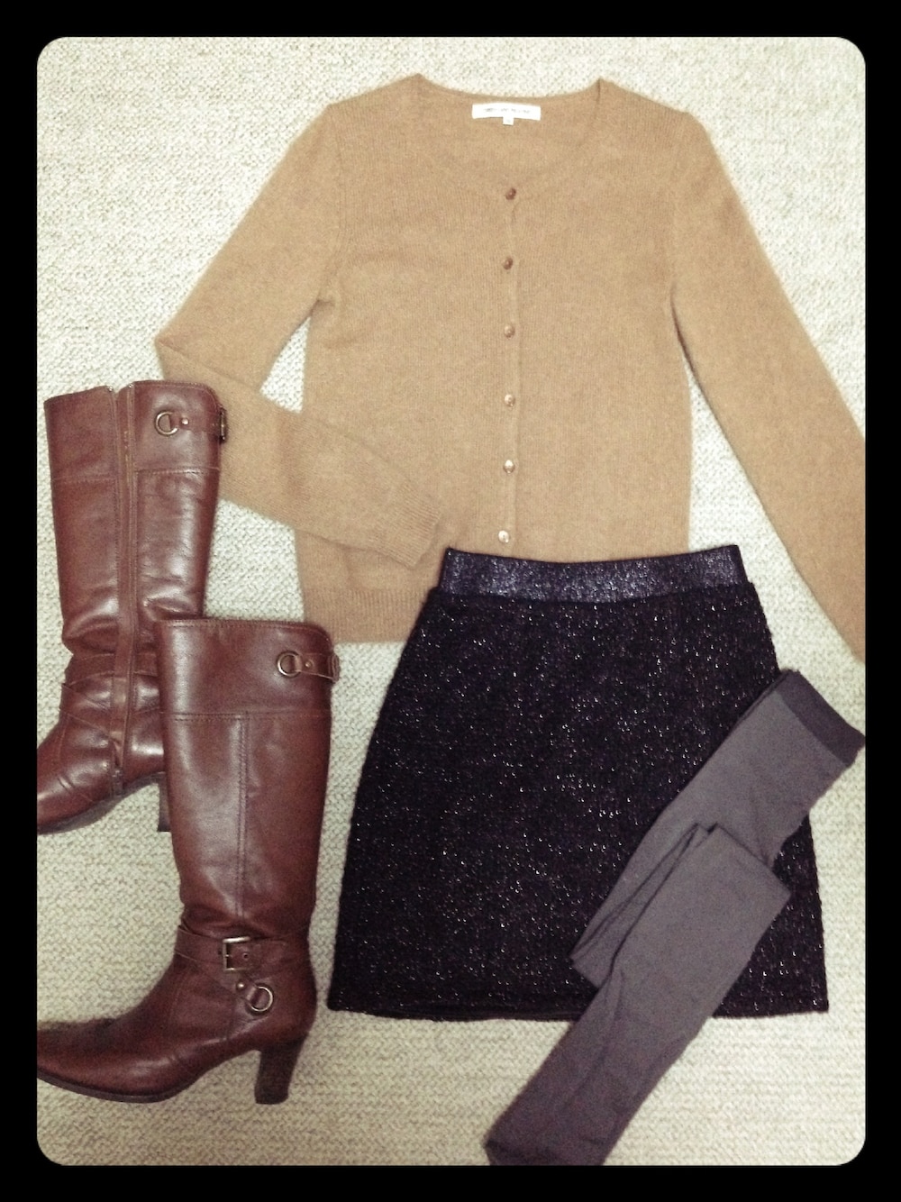 寒かったのでモコモコのモヘアニットを合わせて。グレーのタイツは合わせやすいのでこのニットにも合わせちゃう。 ミニスカートとロングブーツの組み合わせは定番。