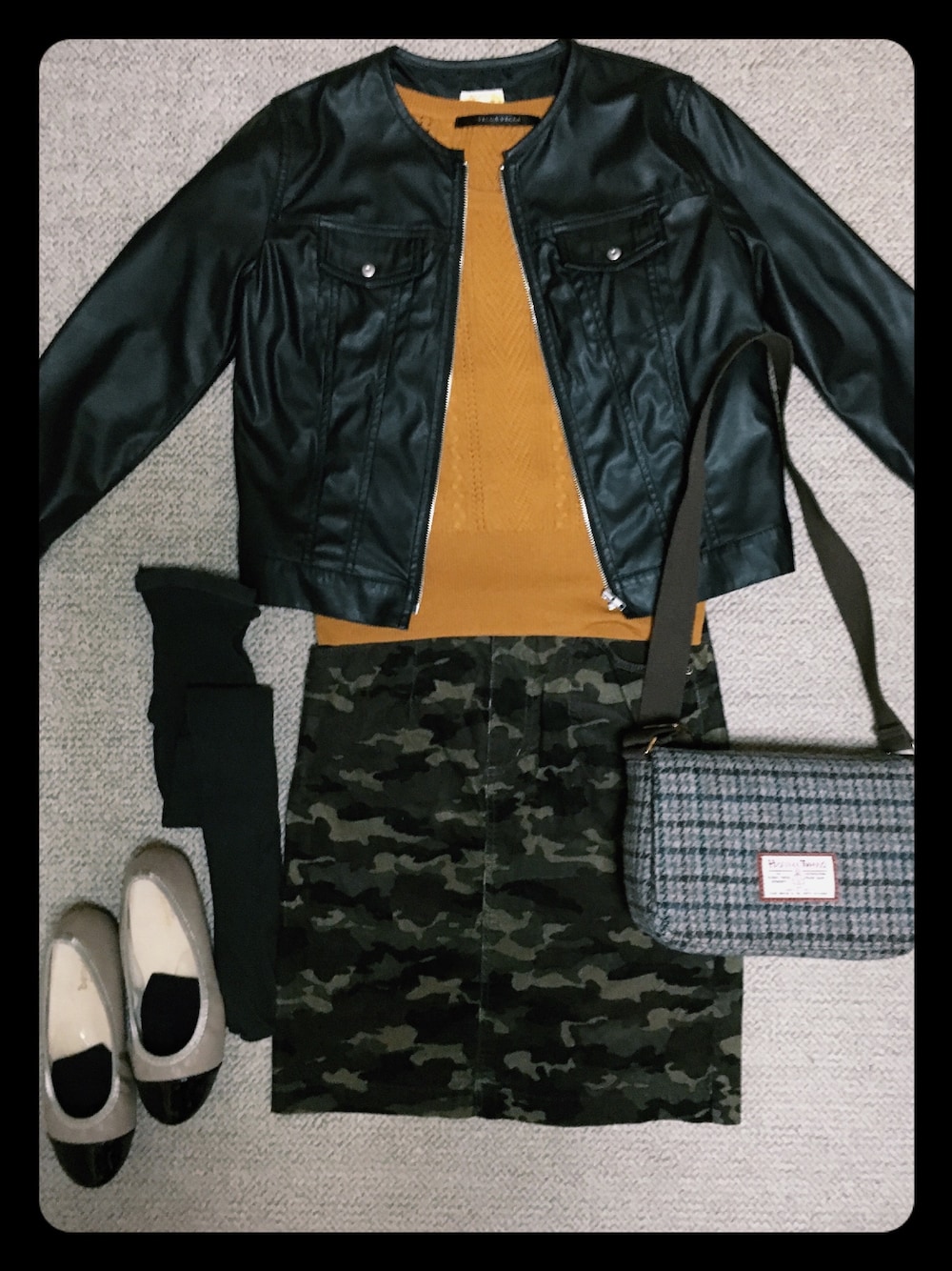 今日は夜勤明けそのまま旅行へ行くのでカジュアルコーディネート。 行き先は八ヶ岳、という事でちょっと寒そうなのでニットとレザージャケットで防寒準備。 財布カメラ携帯の三点セットはハリスツイードのころんとしたバッグの中におさめました。
