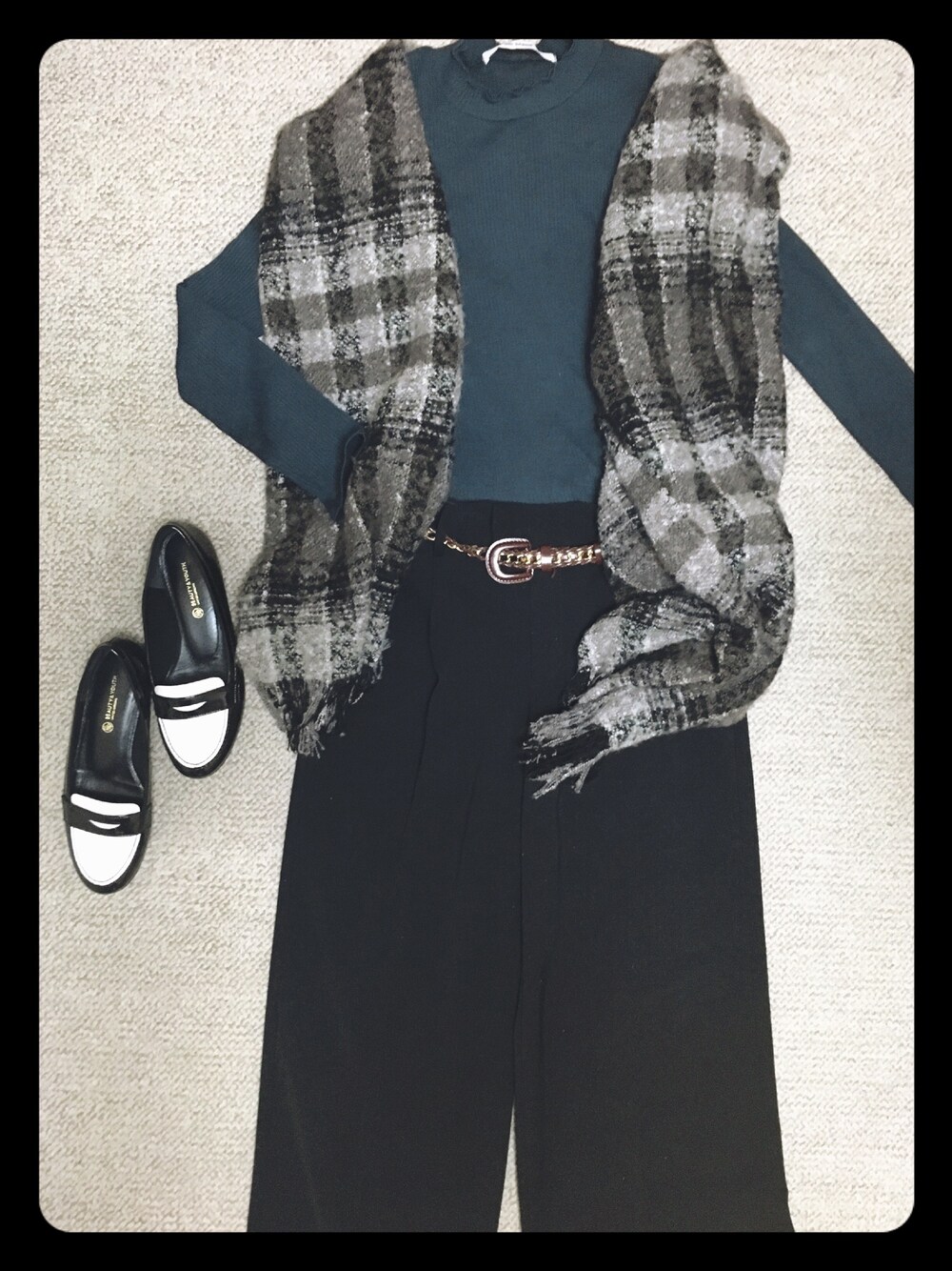 夜勤前に映画を見にいってきたのでら、ラクチンな中にも小物やシューズで少しきちんと感を。 全体的に暗めのトーンになりやすいのでアクセントになるベルトは必需品です。 ベルメゾンで買った大判ストールは今期大活躍しそう。