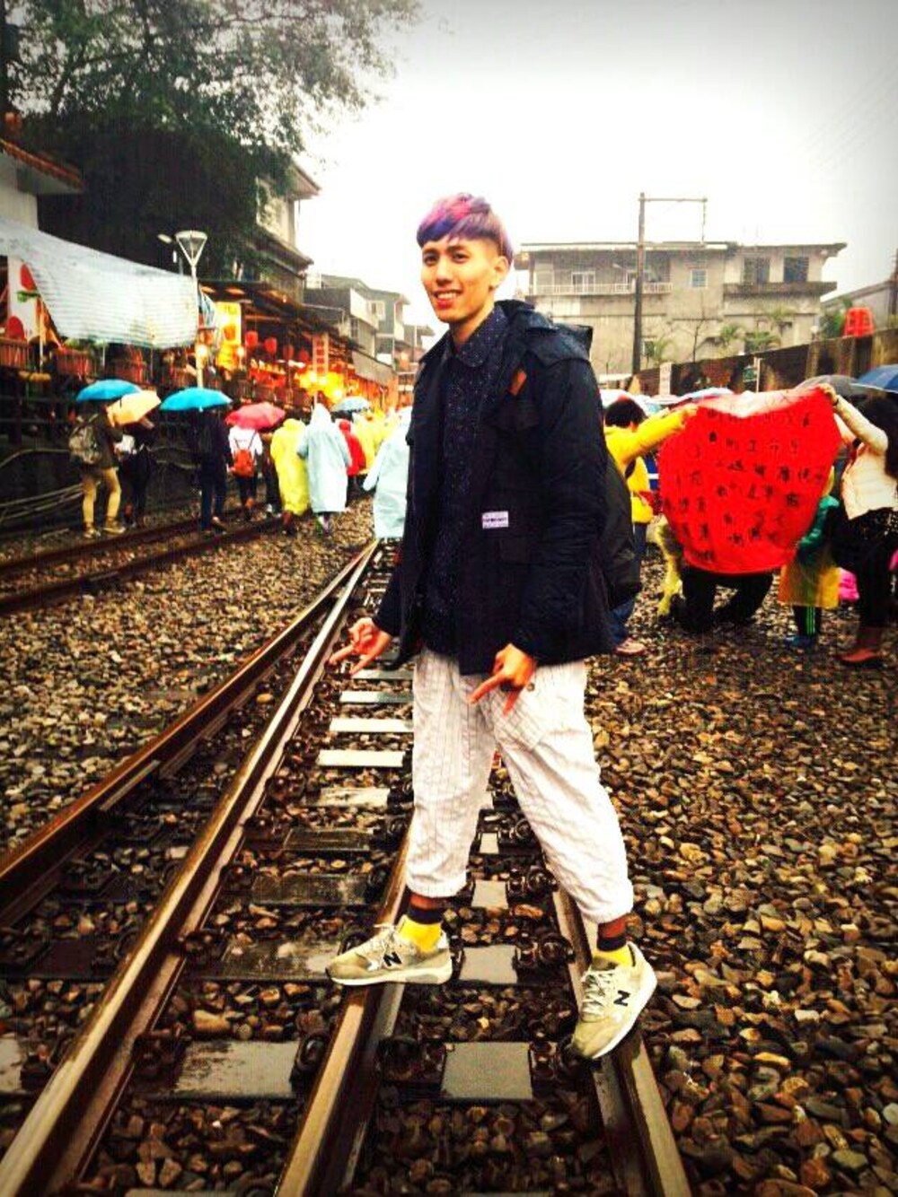 一個寒冷的冬天 放天燈的日子 用深藍色上半身 搭配下半身淺色