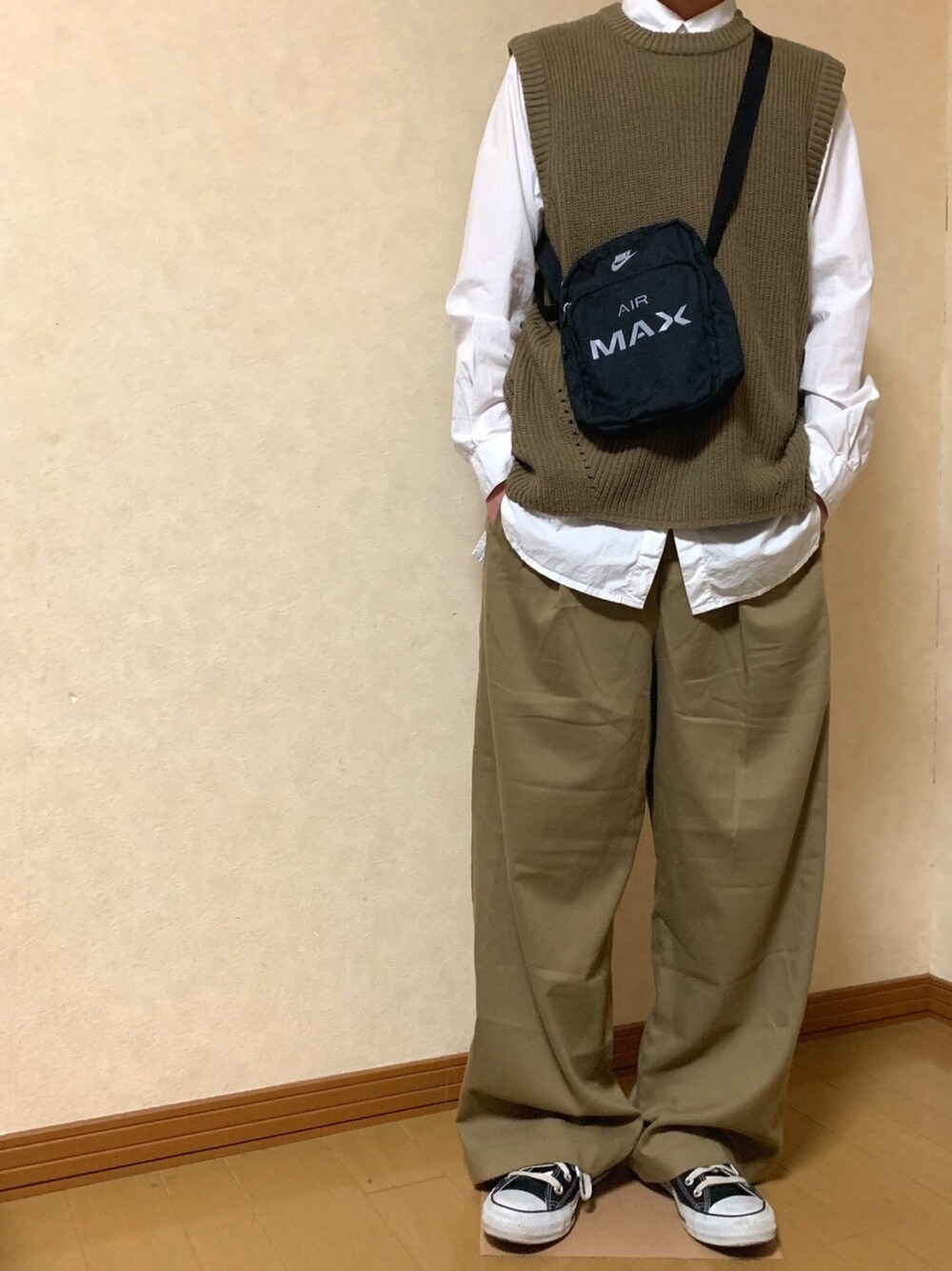 ニットベスト×白シャツ トップスはきっちり♪ ボトムスはゆったり♪