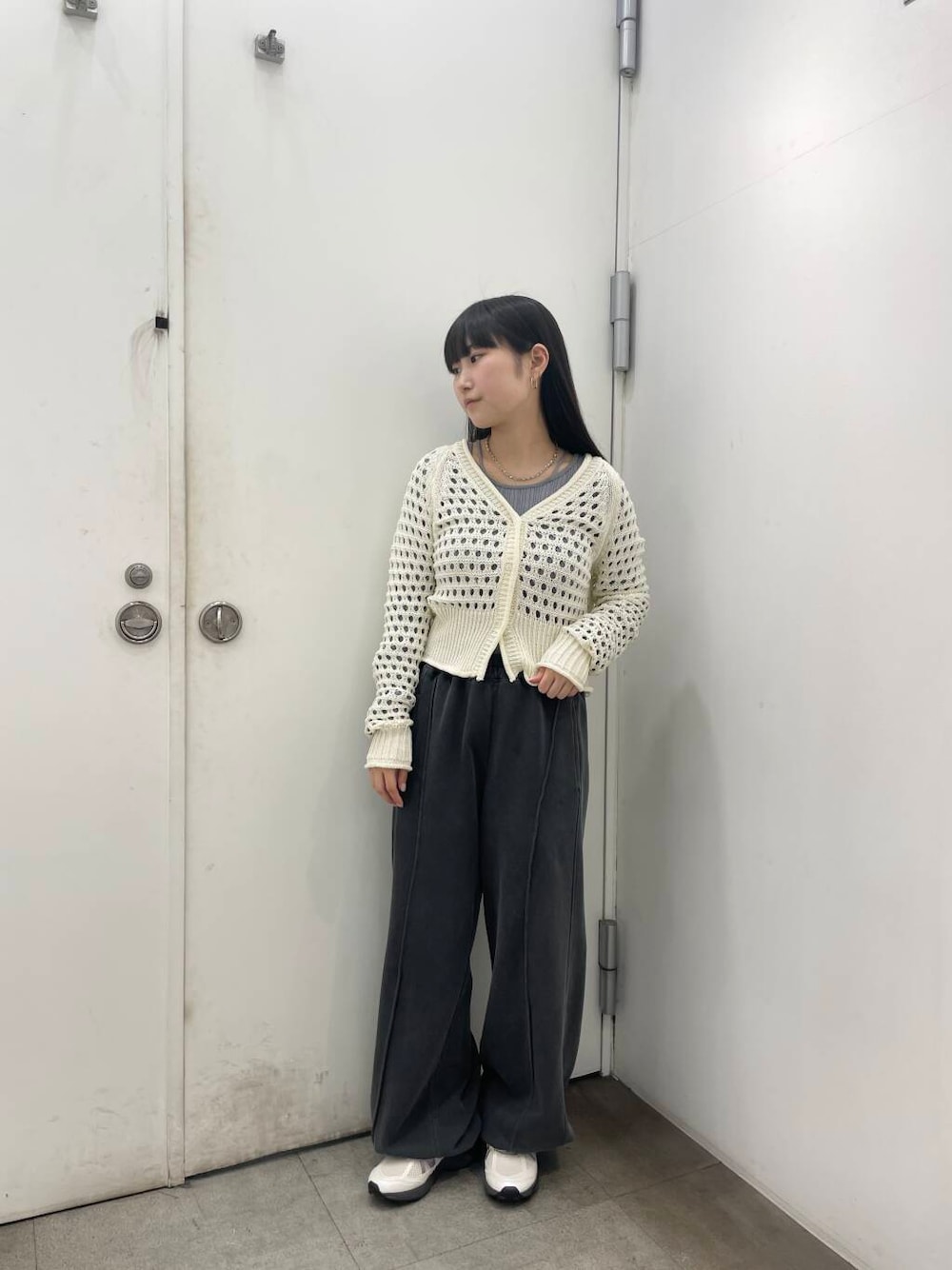 スパンコールメッシュカーディガンは、春のレイヤードコーデで使える万能アイテムです! スニーカーのメタリック感もお気に入りです✨