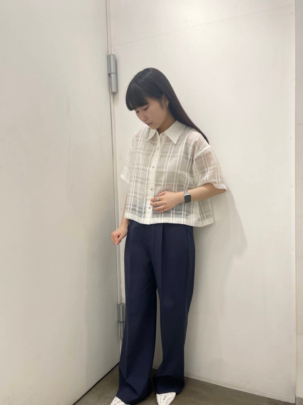 シアーシャツとスラックスを合わせました。 クロップド丈なのがトレンド感もあり、綺麗めに仕上がりました。インナーは目立たないようベージュを選びました。