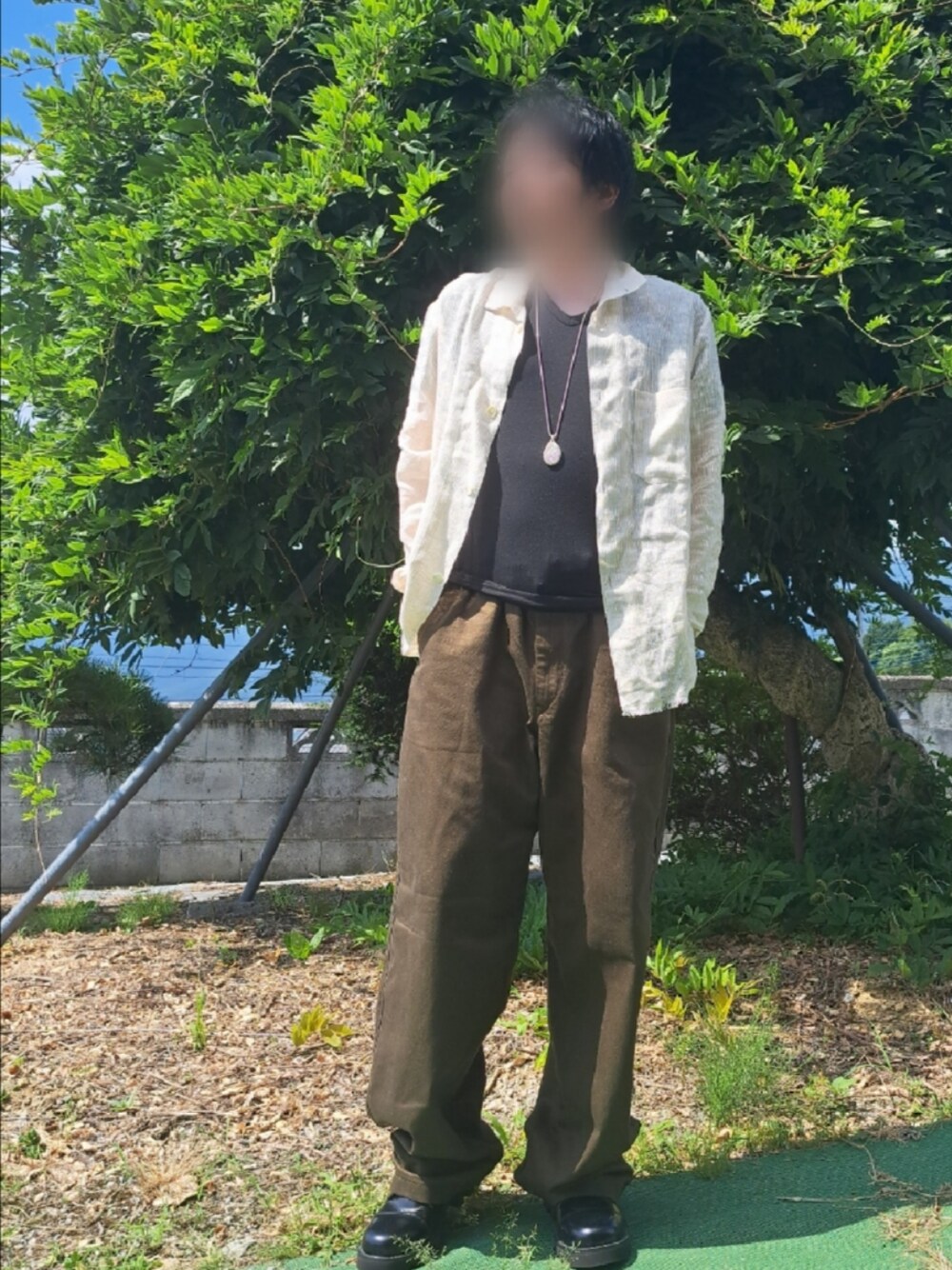 グリーン系のパンツ、ホワイト系のシャツ/ブラウスを着用したメンズの夏コーディネートの1枚目の写真