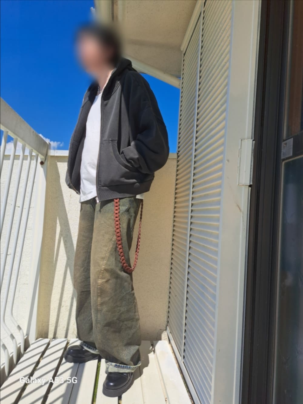 ブラウン系のデニムパンツを着用したメンズの秋コーディネートの1枚目の写真
