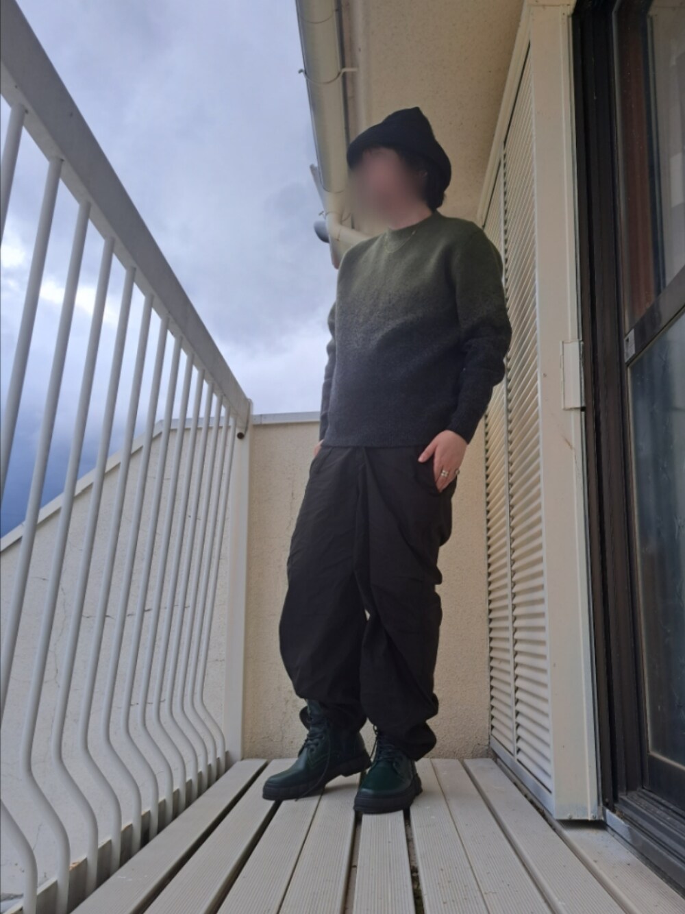 グリーン系のニット/セーターを着用したメンズの秋コーディネートの1枚目の写真