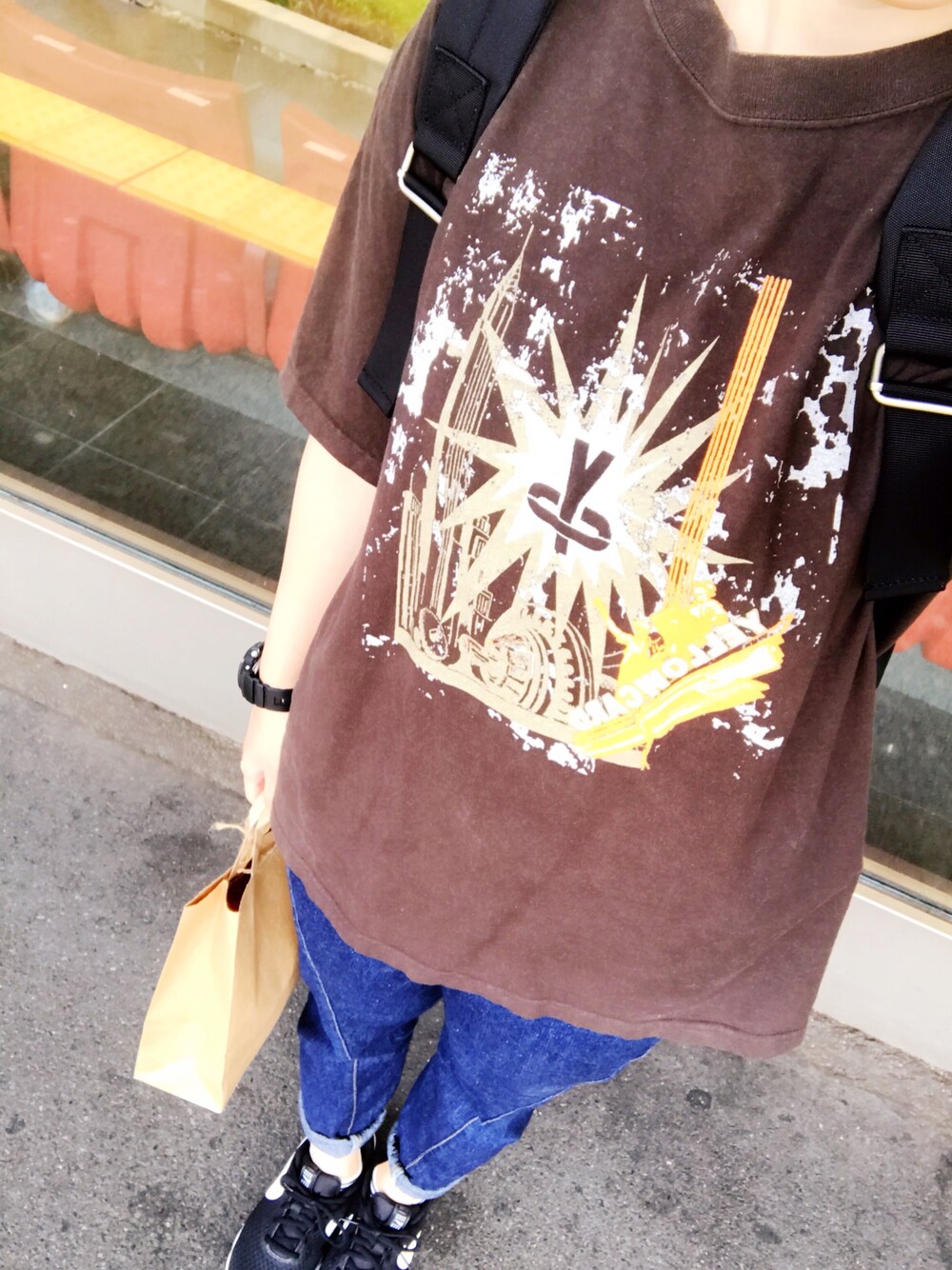 友達と遊ぶー🤝 久々にyellowcardのバンTを着てみた。 ビッグシルエットのTシャツとデニムはサルエルなので、短足スタイル🤗 そんなに暑くならないといいけどな…。